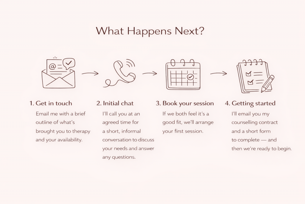 3. I will ring you at the agreed time to have an informal chat where you can share in more detail what you are needing some support with and for me to answer any questions you might have about how therapy with me could help you.